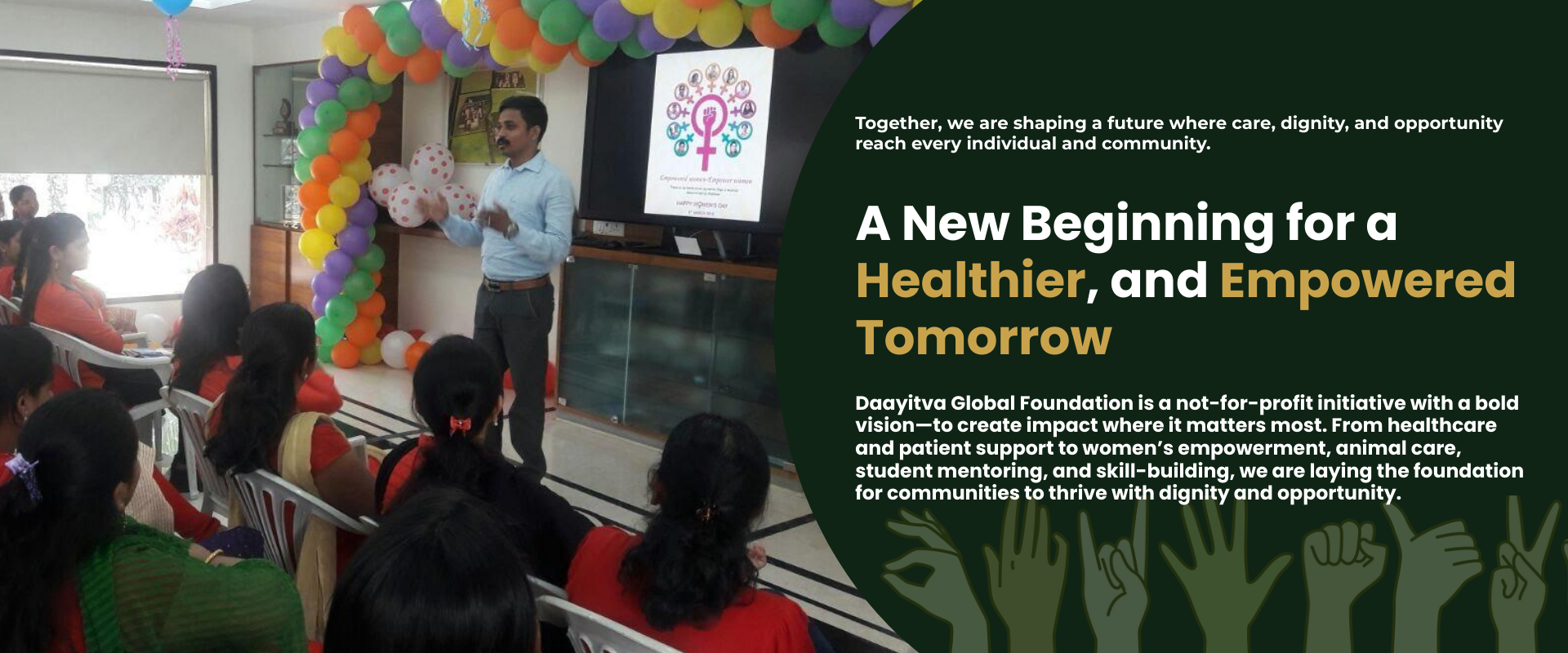 Daayitva Global Foundation, launched in 2025, is a not-for-profit initiative driven by passion and purpose. We unite healthcare, education, women’s empowerment, and animal welfare under one platform, building stronger communities with care, dignity, and opportunity.